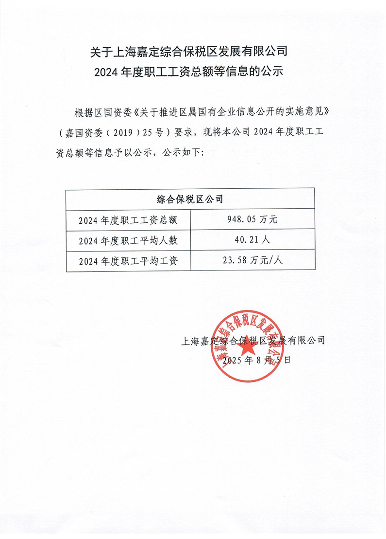关于上海嘉定综合保税区发展有限公司2024年度职工工资总额等信息的公示